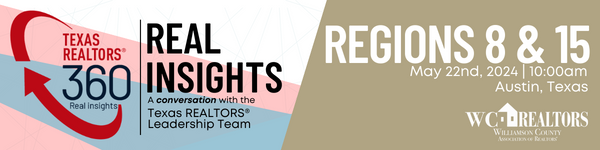 Your Texas REALTORS® 360: Real Insights Meeting is a great opportunity to learn about the latest state and national issues affecting your livelihood - and share your ideas and concerns with local and state leaders in the REALTOR® organization. This year the Regions 8 & 15 regional meeting will be held in Austin and if you haven’t registered, do so today! Here’s what’s planned: